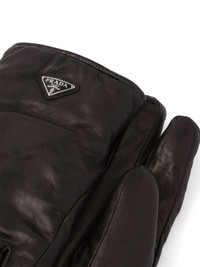 triangle-logo leather gloves First used by Mario Prada in 1913 as a symbol of quality and craft, the triangle logo has since become Prada's most recognisable signature. Crafted from leather, these black gloves are adorned with the geometric enamel plaque at the wrists. Highlights - Black - Nappa leather - Enamel triangle logo - Slip-on style - D-ring findings Composition Nappa Leather 100%