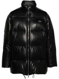 logo-plaque leather puffer coat Highlights - Black - Lambskin/goose down - Padded design - Quilted - Silver-tone enamel triangle logo plaque - Logo-engraved silver-tone hardware - Mock neck - Concealed hood - Front two-way zip fastening - Drop shoulder - Long sleeves with elasticated cuffs - Zip-fastening chest pocket - Two side zip-fastening pockets - Full lining - Internal zip-fastening pocket - Two internal stud-fastening pockets - Drawstring hem Composition Outer: Lambskin 100% Lining: Polyester 100%, Recycled Polyamide 100%, Goose Down 100% SIZE & FIT Model measurements Height 6 ft 1 in(1.86 m) Bust/Chest 36.61 in(93 cm) Hips 37 in(94 cm) Waist 28.74 in(73 cm) FittingInformation Designed to be unstructured, offering a loose fit throughout Made from a padded non-stretch fabric, giving it no natural elasticity This piece fits true to size – take your usual size