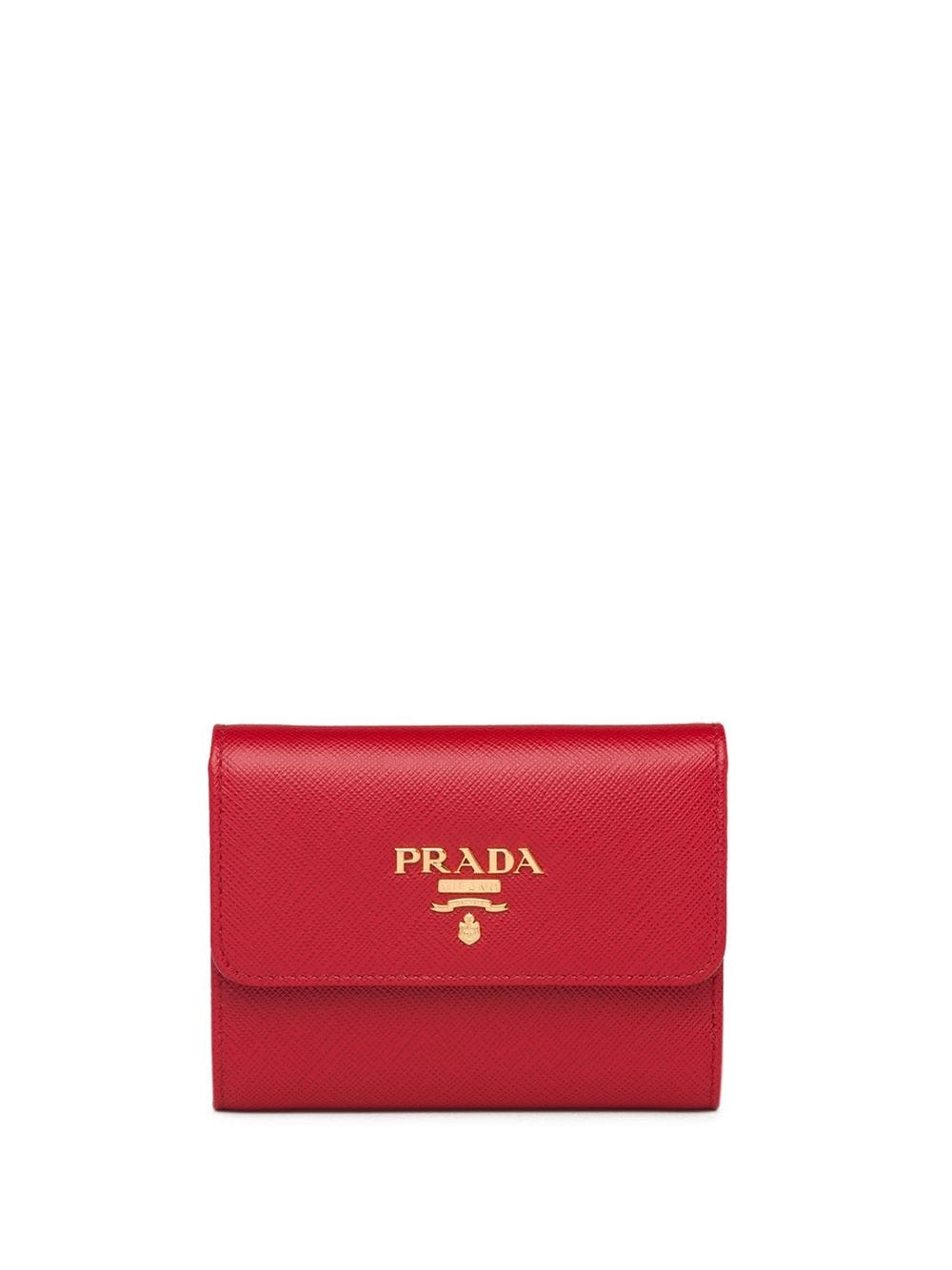 logo-plaque square wallet Carry your cash in couture. With a square shape and logo plaque, this wallet from Prada is going to make the ultimate companion from now on. Turn looks, and heads. Highlights - Red - Calf leather - Gold-tone logo plaque - Square shape - Foldover top Composition Outer: Calf Leather 100%, Metal 100% Lining: Nylon 100%