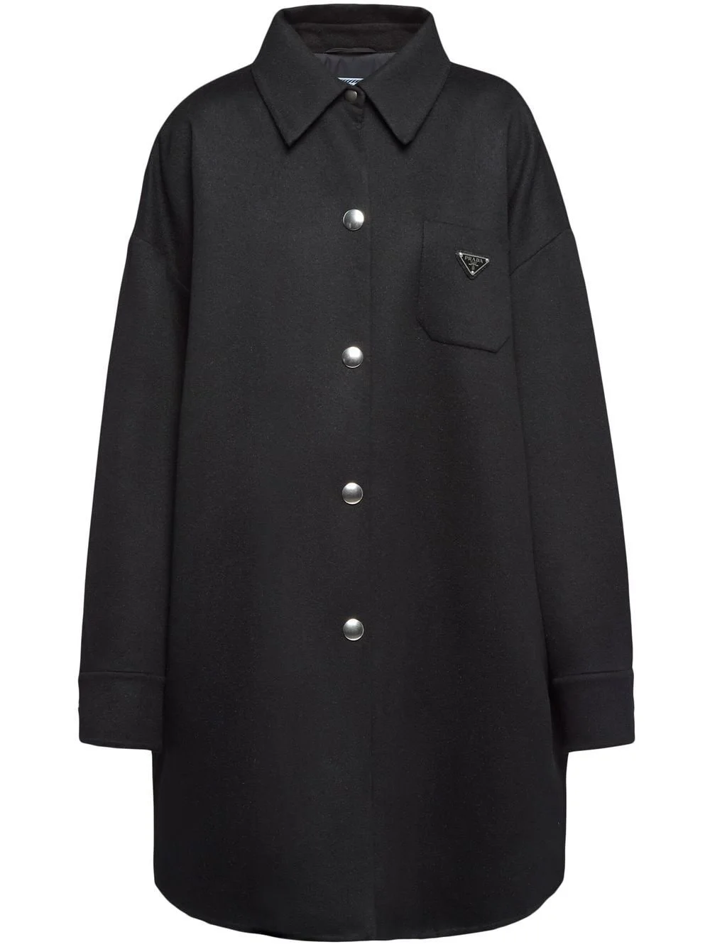 logo-plaque wool coat Prada's minimalist vision is indulged in this single-breasted wool coat through its straightforward silhouette and tonal design. The brand's iconic triangular logo plaque punctuates the piece in its effortless embellishment at the chest. Highlights - Black - Wool - Enamel triangle logo - Classic collar - Front press-stud fastening - Chest patch pocket - Long sleeves - Press-stud fastening cuffs - Curved hem Composition Outer: Wool 100% Lining: Nylon 100%