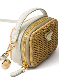 logo-plaque woven-wicker pouch Highlights - Beige/white - Woven wicker design - Leather trim - Enamel triangle logo - Logo charm - Adjustable detachable shoulder strap - Single flat top handle - Top zip fastening - Main compartment - Internal logo patch - This piece comes complete with a protective dust bag. Composition Outer: Leather 100%, Wicker 100% SIZE & FIT Measurement DEPTH 0.78 in(2 cm) HEIGHT 2.36 in(6 cm) WIDTH 4.33 in(11 cm)
