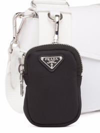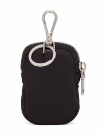 logo-plaque zip-fastening pouch Featuring Prada's triangle logo plaque at the front of this zip-fastening pouch, it references the brands heritage in a contemporary way. Here, the workmark first used in 1919 is now surrounded by a geometric shape. In silver-tone hardware it punctuates a tonal design and adds a sleek, timeless edge. Highlights - Black - Recycled nylon - Logo plaque - Top zip fastening - Silver-tone hardware - Main compartment - Clasp fastening - Keyring attachment Composition Recycled Nylon 100% SIZE & FIT Measurement LENGTH 3.74 in(9.5 cm) WIDTH 2.55 in(6.5 cm)