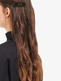 logo-print studded hair clip A little logo goes a long way. For an ultra-finished look, place this petite Prada piece in your hair and head out in style. You can expect compliments. Composition Plexiglass 100%, Metal 100% SIZE & FIT Measurement LENGTH 2.75 in(7 cm) WIDTH 0.98 in(2.5 cm)