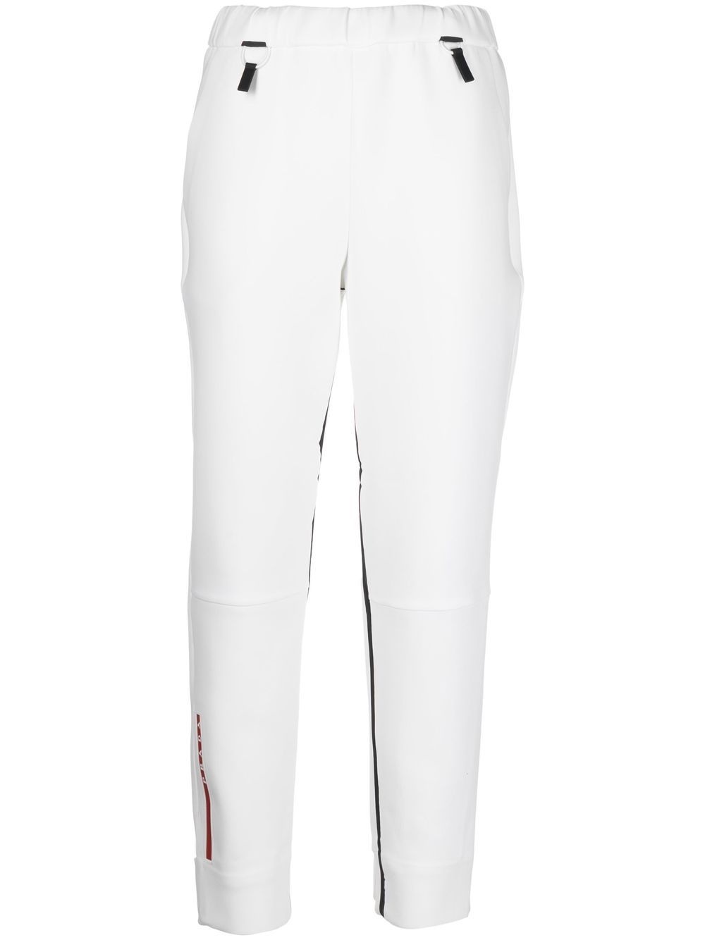 logo-print track pants Crafted from a blend of recycled materials, these Prada track pants offer an effortless silhouette. The relaxed straight leg silhouette boasts subtle branding in the form of a red-toned logo stripe at the leg, a variation of the brand's iconic logo which permeates the SS23 designs. Highlights - Optical white - Recycled polyester - Stretch-design - High waist - Logo print at the leg - Two diagonal pockets to the sides Composition Lining: Recycled Polyester 100% Outer: Recycled Polyester 84%, Spandex/Elastane 16% SIZE & FIT Model measurements Height 5 ft 10 in(1.77 m) Bust/Chest 32.28 in(82 cm) Hips 35.03 in(89 cm) Waist 25.19 in(64 cm) FittingInformation This piece fits true to size. We recommend you get your regular size Cut for a slim fit Made with a mid-weight stretch fabric
