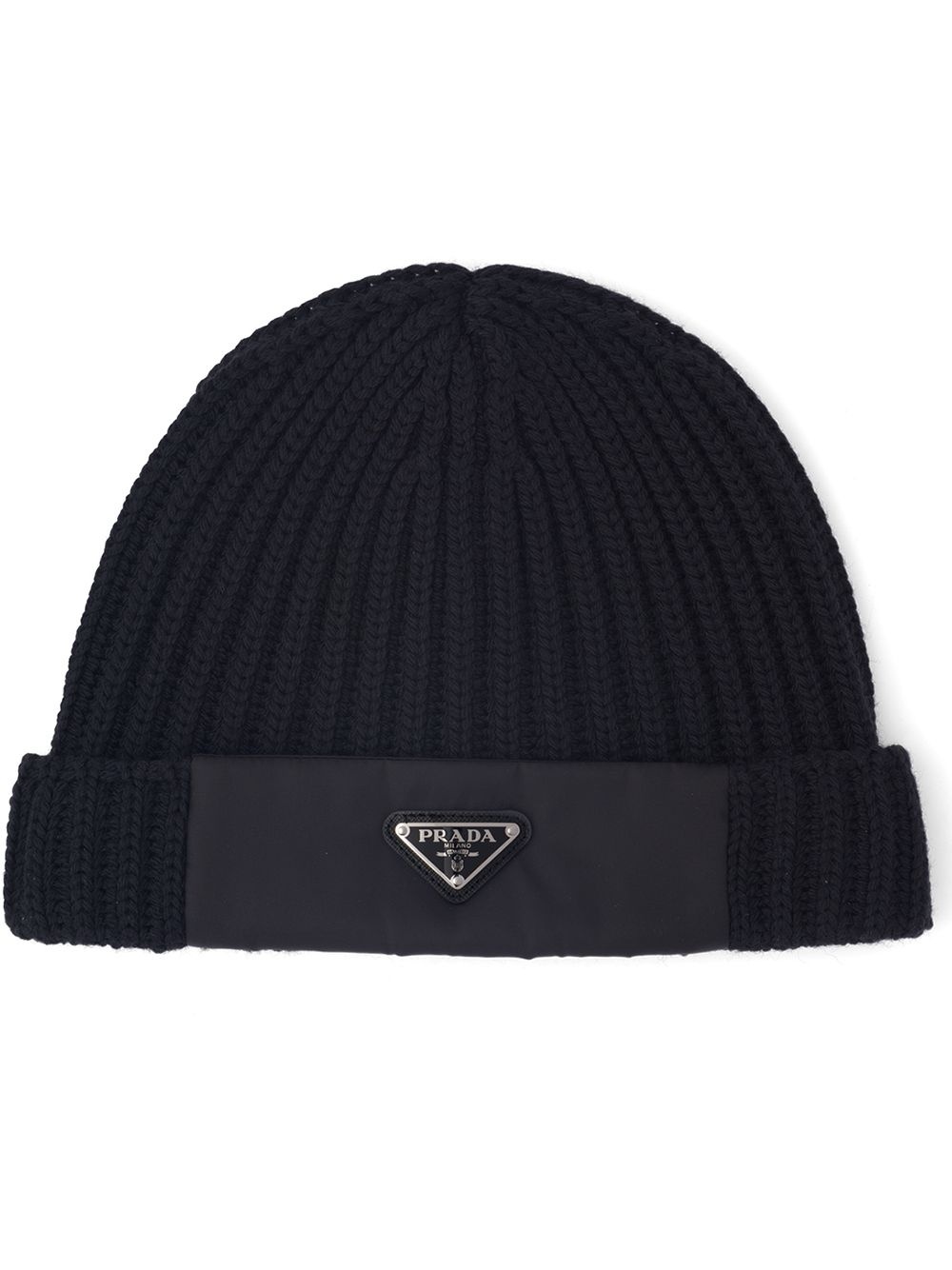 Re-Nylon knitted hat A great beanie never goes out of style. This one from Prada has been spun from virgin wool and has a Re-Nylon patch on the front with the signature enamel triangle logo. Keeping cosy never looked so good. Highlights - Black - Virgin wool/recycled polyamide - Logo plaque - Ribbed knit Composition Recycled Polyamide 100%, Virgin Wool 100%