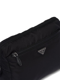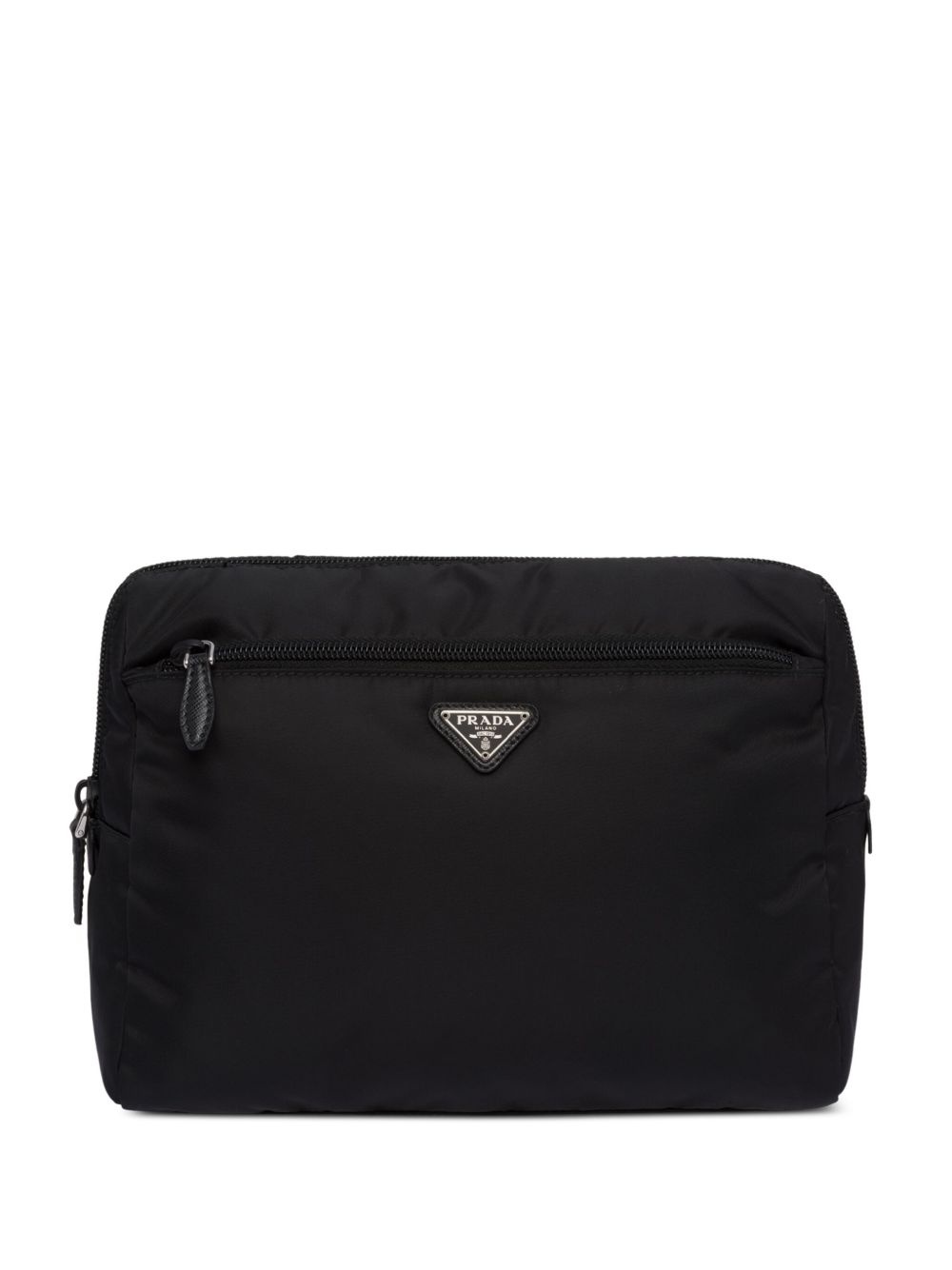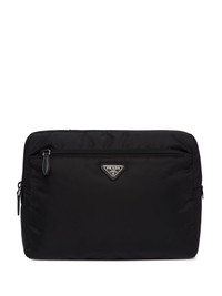 logo-triangle pouch Highlights - Black - Recycled polyamide - Enamel triangle logo - All-around zip fastening - Leather trim - Front zip-fastening pocket - Contrast lining - Main compartment - Internal zip-fastening pocket Composition Outer: Recycled Polyamide 100%, Calf Leather 100% SIZE & FIT Measurement DEPTH 3.93 in(10 cm) HEIGHT 7.48 in(19 cm) WIDTH 10.23 in(26 cm)