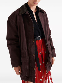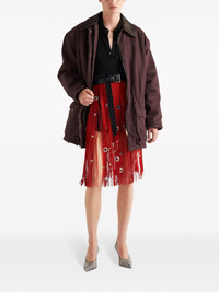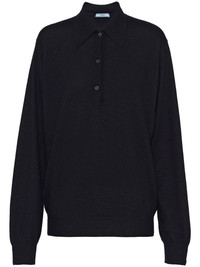 long-sleeve cashmere polo shirt Prada presents a wardrobe staple in this polo shirt, evident through its premium cashmere construction and all-black colour palette. Highlights - Black - Cashmere - Fine knit - Pointed collar - Long sleeves - Ribbed cuffs and hem - Triangle logo to the rear - Internal logo tag - Straight hem - Front button placket Composition Cashmere 100%