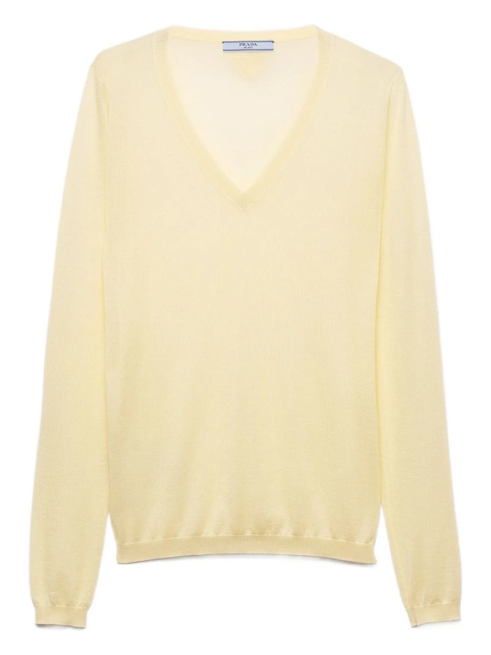 long-sleeve sweater Highlights - Yellow - V-neck - Long sleeves - Ribbed cuffs and hem Composition Cashmere 70%, Silk 30% Washing instructions Read Manufacturer Guidelines