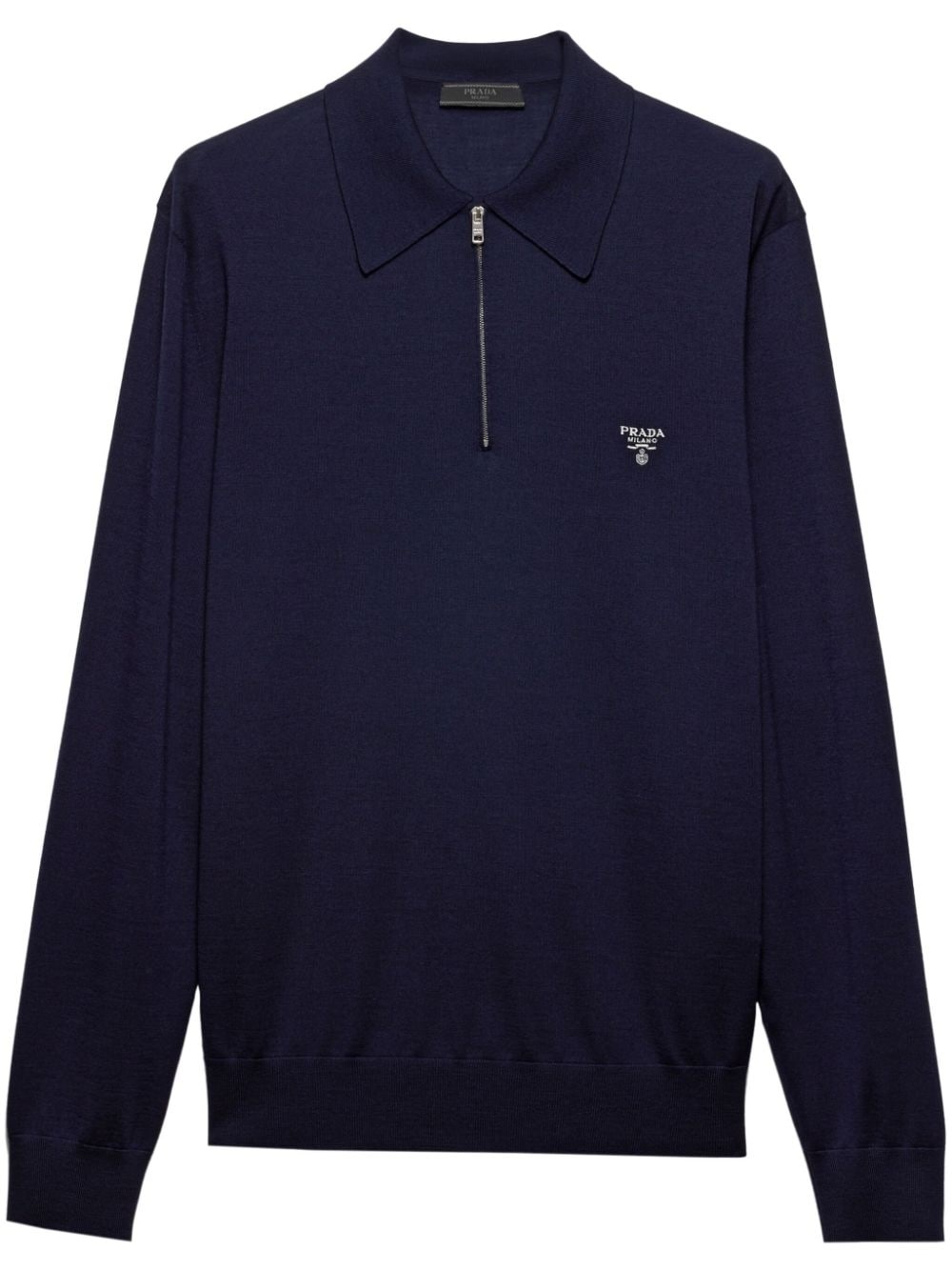 long-sleeve wool polo shirt Highlights - Navy blue - Wool - Fine knit - Embroidered logo at the chest - Polo collar - Front zip fastening - Long sleeves - Ribbed edge - Straight hem Composition Wool 100% Washing instructions Read Manufacturer Guidelines