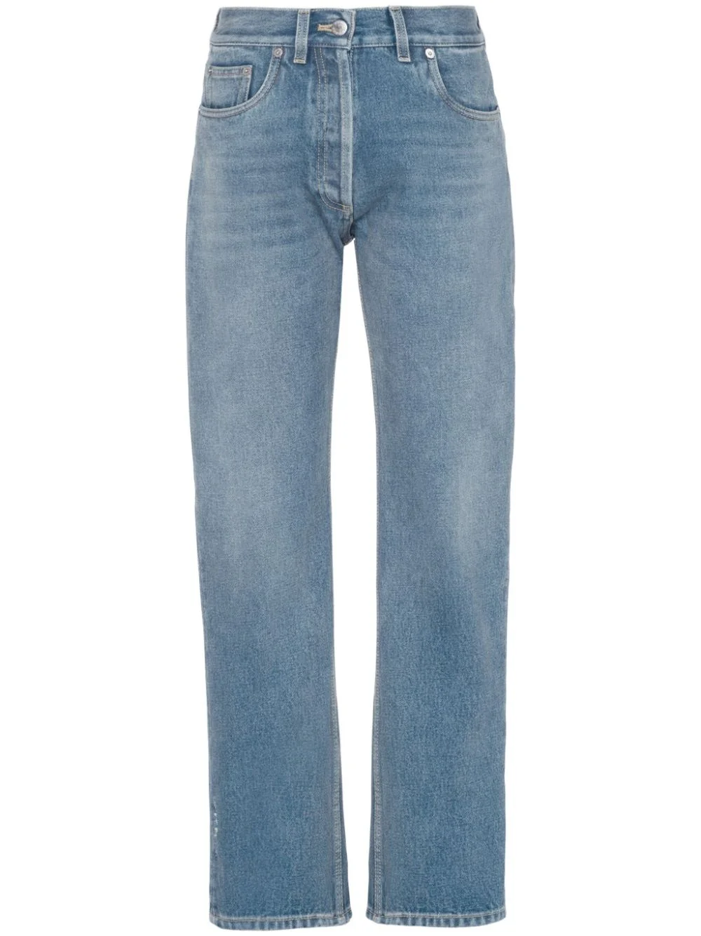 low-rise organic-denim jeans Highlights - Sky blue - Cotton - Denim - Enamel triangle logo - Mid-rise - Belt loops - Concealed fly and button fastening - Classic five pockets - Straight leg Composition Cotton 100% SIZE & FIT FittingInformation Designed for a straight-leg fit, these jeans allow for a close fit at the waist and an unrestricted and comfortable fit over the leg Sturdy and hard-wearing, this denim piece offers no stretch