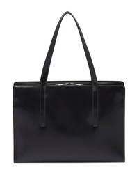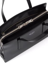 large Re-Edition 1995 leather handbag A structured silhouette creates a refined look for this Re-Edition 1995 tote bag from Prada. Understated logo detailing speaks to the brand's focus on construction over bold branding. Highlights - Black - Leather - Brushed finish - Hanging key fob - Logo stamp to the front - Silver-tone hardware - Two long top handles - Top zip fastening - Partitioned compartment - Internal zip pocket - Internal logo plaque Composition Outer: Leather 100% SIZE & FIT Measurement DEPTH 3.14 in(8 cm) HANDLE 7.08 in(18 cm) HEIGHT 8.26 in(21 cm) WIDTH 11.81 in(30 cm)