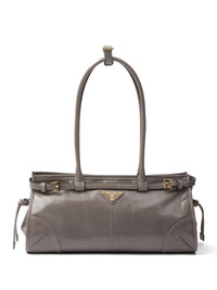 medium Bonnie tote bag Imagined in a grey hue, this bag from Prada is crafted from leather, whilst the iconic triangle logo is adorned at the front, for a subtle yet recognisable finish. Highlights - Brown - Leather - Smoothing finish - Enamel triangle logo - Belted silhouette - Two rolled top handles - Adjustable handle wrap - Two adjustable detachable shoulder straps - Top zip fastening - Internal zip-fastening pocket - Internal logo plaque - Logo-print lining - Gold-tone hardware - Rectangle body Composition Outer: Leather 100% SIZE & FIT Measurement DEPTH 4.72 in(12 cm) HEIGHT 6.1 in(15.5 cm) STRAP 49.21 in(125 cm) WIDTH 12.59 in(32 cm)