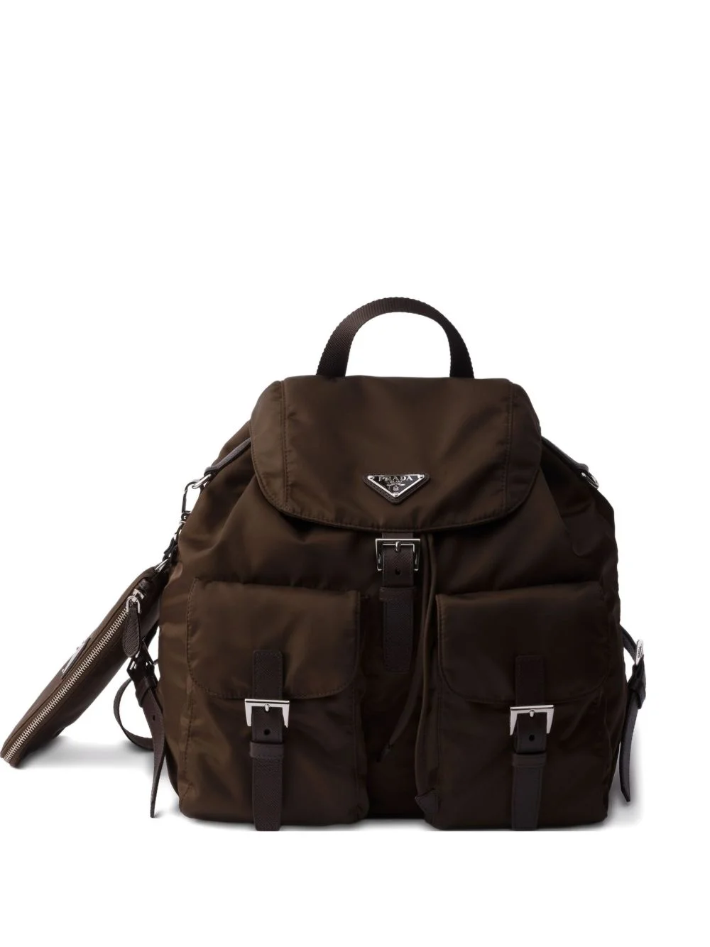 medium front-pockets backpack Highlights - Brown - Saffiano leather details - Adjustable woven shoulder straps - Metal hardware - Enameled metal triangle logo - Drawstring fastening Composition Saffiano Leather 100%, Recycled Polyamide 100% Washing instructions Dry Clean Only