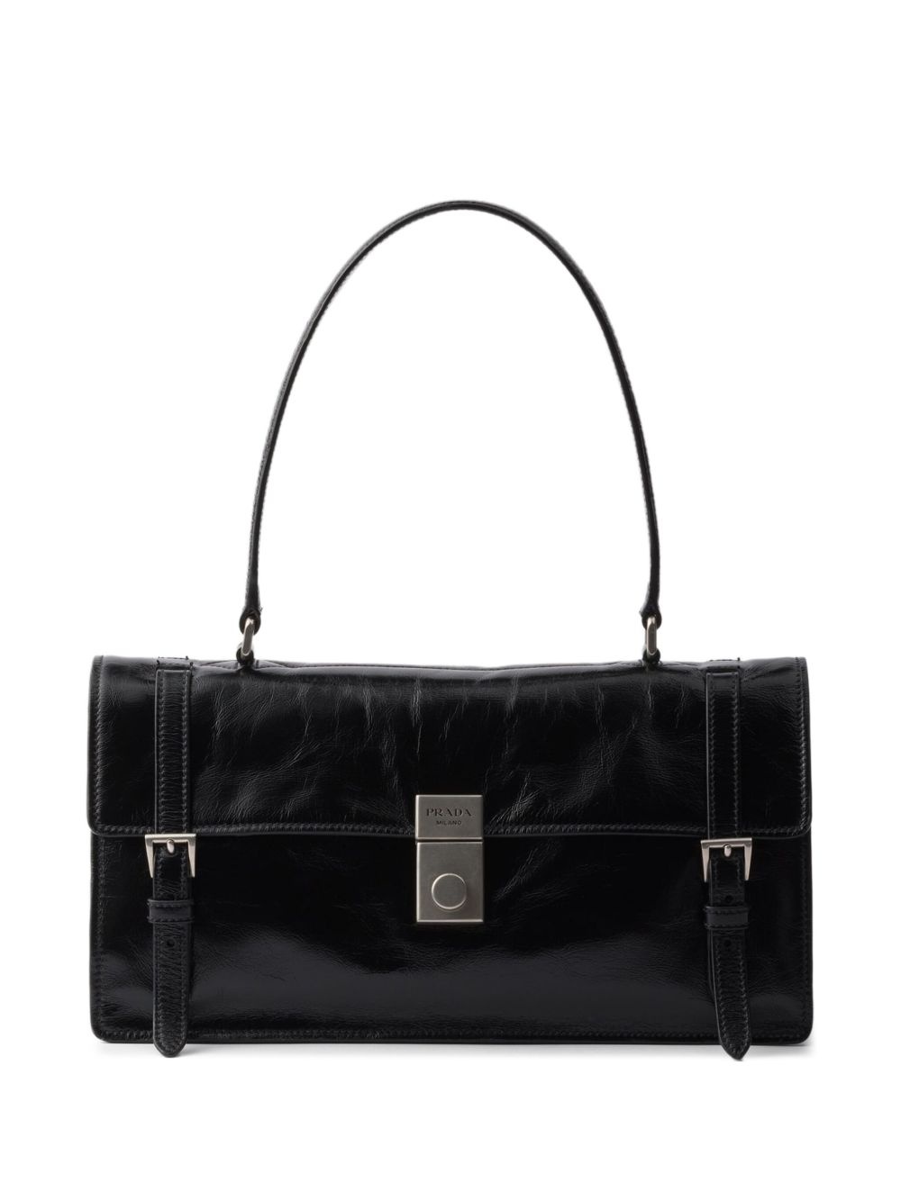 medium leather shoulder bag Highlights - Black - Polished finish - Flap top - Silver-tone hardware - Front clasp closure - Single top handle - Exterior pocket - Tonal stitching - Logo detail Composition Outer: Calf Leather 100% Lining: Nappa Leather 100% SIZE & FIT Measurement DEPTH 3.93 in(10 cm) HEIGHT 6.49 in(16.5 cm) WIDTH 12.59 in(32 cm) STRAP 7.87 in(20 cm)