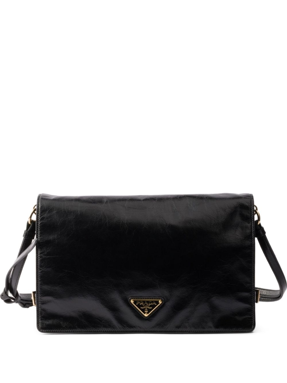 medium leather shoulder bag Highlights - Black - Foldover top with magnetic fastening - Adjustable shoulder strap - Enamel triangle logo Composition Lining: Nylon 100% Outer: Calf Leather 100% SIZE & FIT Measurement DEPTH 3.54 in(9 cm) HEIGHT 7.28 in(18.5 cm) WIDTH 11.81 in(30 cm)