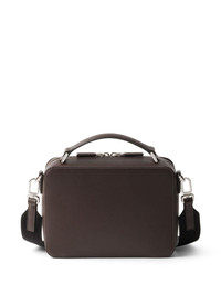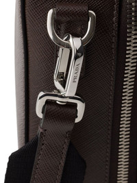 medium Saffiano leather bag Highlights - Cedar brown - Leather - Silver-tone hardware - Enamel triangle logo - Single top handle - Adjustable detachable shoulder strap - Top zip fastening - Main compartment Composition Outer: Leather 100%, Nylon 100% SIZE & FIT Measurement DEPTH 2.36 in(6 cm) HEIGHT 6.29 in(16 cm) WIDTH 8.66 in(22 cm)