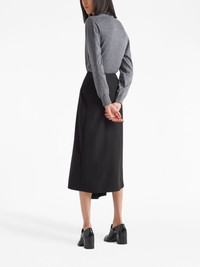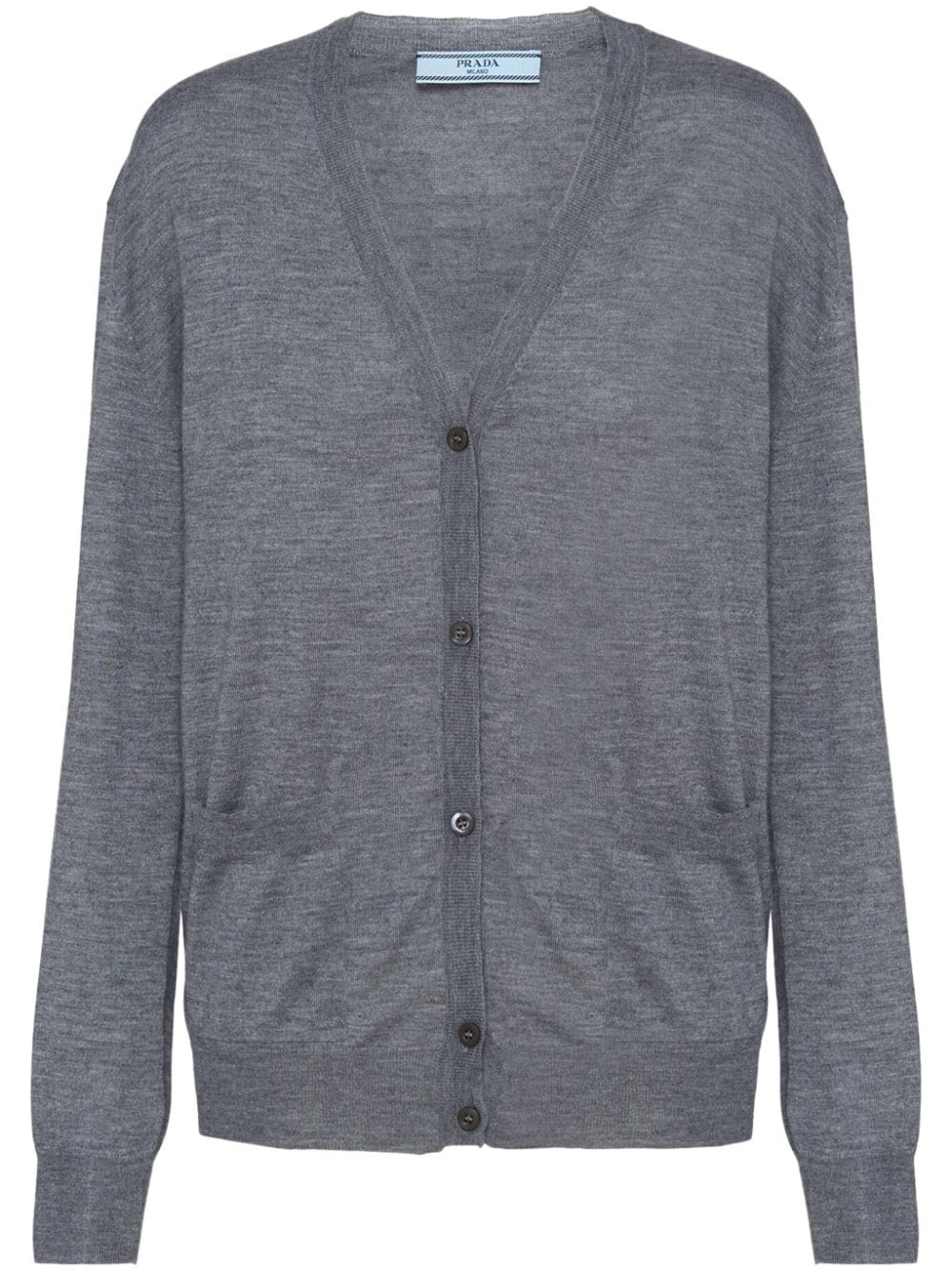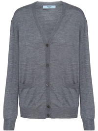V-neck wool-cashmere cardigan A testament to Prada's irreproachable Italian craftsmanship, this lightweight cardigan is spun from sumptuous cashmere that are cross dyed to create a soft heathered effect. Highlights - Slate grey - Cashmere - Melange effect - V-neck - Front button fastening - Drop shoulder - Long sleeves - Two front patch pockets - Ribbed trim - Straight hem Composition Wool 100%, Cashmere 100% Washing instructions Read Manufacturer Guidelines