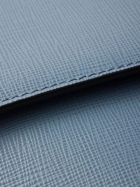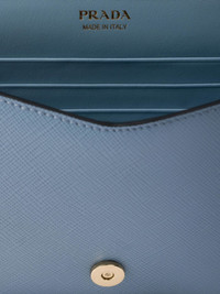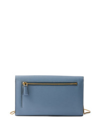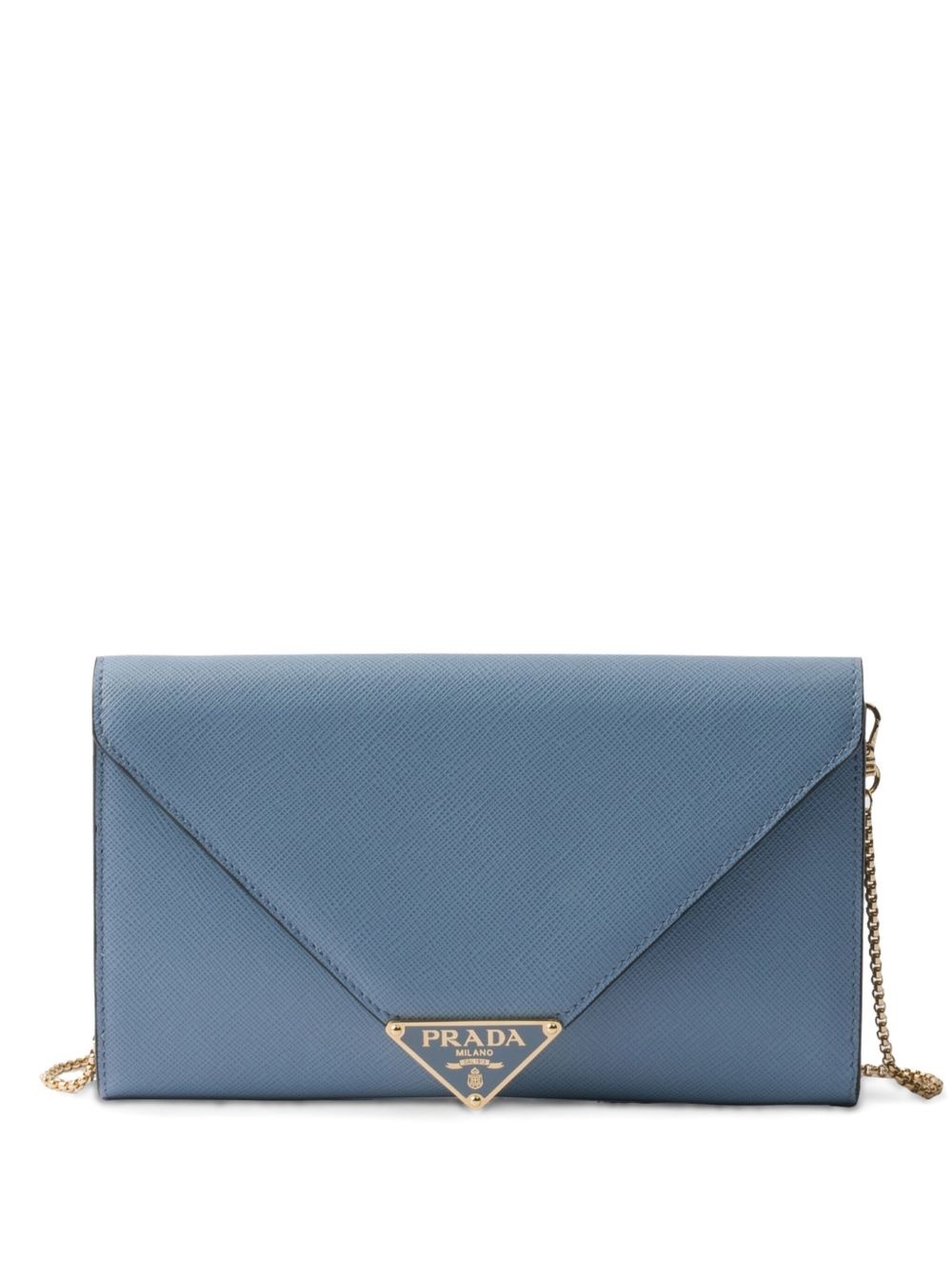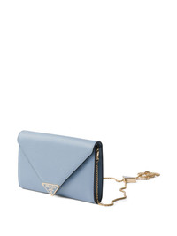 mini Saffiano leather clutch bag Highlights - Sky blue - Foldover top with magnetic fastening - Detachable chain-link shoulder strap - Rear zip-fastening pocket - Internal card slots Composition Outer: CALFSKIN 100% SIZE & FIT Measurement HEIGHT 4.52 in(11.5 cm) WIDTH 7.87 in(20 cm)