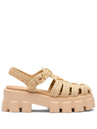 Monolith raffia sandals These Prada sandals are defined by their Monolith chunky lug sole. Their cage-like silhouette is crafted from raffia; it secures with a gold-tone buckle and is adorned with the iconic triangle logo. Highlights - Beige - Woven raffia design - Caged design - Round toe - Enamel triangle logo - Leather lining - Chunky rubber lug sole - Rfid authenticity tag - Gold-tone hardware - Buckle-strap fastening Composition Sole: Rubber 100% Lining: Calf Leather 100% Outer: Raffia 100% SIZE & FIT Measurement HEEL 2.16 in(5.5 cm)