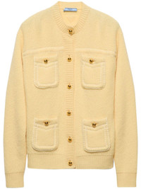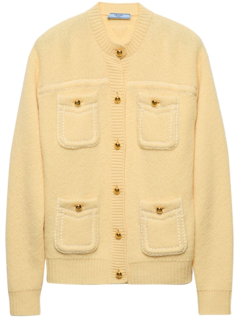 multiple-pockets cashmere cardigan Highlights - Light yellow - Cashmere - Knitted construction - Four front patch pockets - Contrast stitching - Crew neck - Front button fastening - Gold-tone buttons - Triangle logo to the rear - Long sleeves - Ribbed edge - Straight hem Composition Cashmere 100%