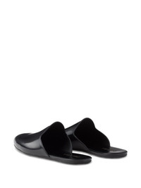 open-back slippers Highlights - Black - Smooth finish - Slip-on design - Open back - Rounded toe - Logo detailing Composition Sole: Rubber 100% Lining: Calf Leather 100% Outer: Patent Calf Leather 100%