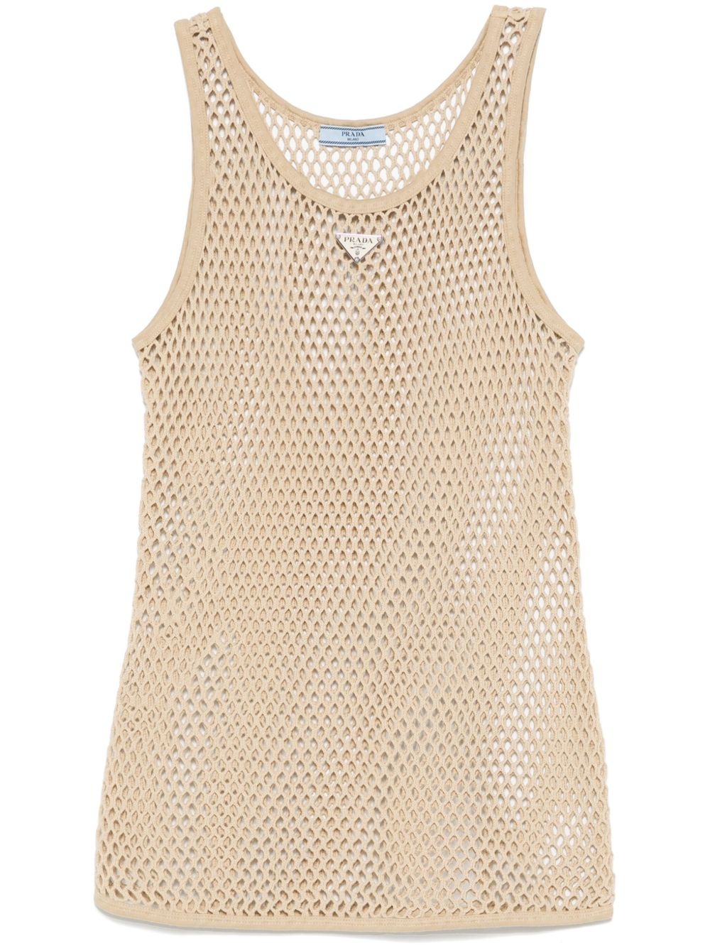 open-knit tank top Highlights - Beige - Scoop neck - Sleeveless - Enamel triangle logo - Cut-out detailing Composition Cotton 100% SIZE & FIT Model measurements Height 5 ft 10 in(1.78 m) Bust/Chest 33.46 in(85 cm) Hips 36.22 in(92 cm) Waist 23.22 in(59 cm) FittingInformation Designed for a slim fit that sits just away from the body offering a close yet comfortable fit Made with a lightweight knit, this piece offers some stretch