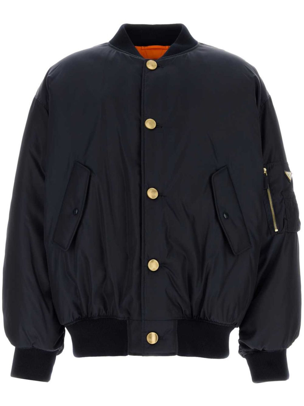 padded bomber jacket Highlights - Blue - Recycled polyamide - Padded design - Button fastening - Concealed front zip fastening - Ribbed band collar - Long sleeves - Two front flap pockets - Logo patch at the sleeve - Triangle logo - Sleeve zip pocket - Ribbed cuffs and hem Composition Recycled Polyamide 100% Washing instructions Read Manufacturer Guidelines