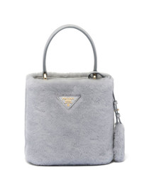 mini Panier shearling tote bag Highlights - Light grey - Calf leather/shearling - Triangle logo - Keyring attachment - Partitioned compartment - Single rolled top handle - Adjustable detachable shoulder strap Composition Outer: Calf Leather 100%, Sheep Skin/Shearling 100% Lining: Calf Leather 100% SIZE & FIT Measurement DEPTH 3.74 in(9.5 cm) HEIGHT 6.29 in(16 cm) STRAP 41.33 in(105 cm) WIDTH 5.9 in(15 cm)