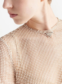 pearl-embellished mesh top Prada presents this elegant top for AW22, embellished with lustrous pearl embroidery. The ivory-hued garment is complete with the sleek triangle logo, contrasting the overall soft look. Composition Nylon 100%