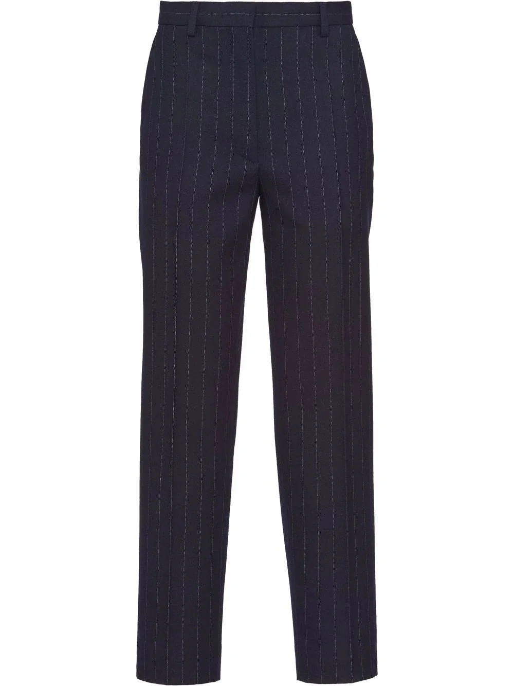 pinstripe-pattern tailored trousers Prada showcases the brand's modern approach to classic tailoring in this pair of trousers. Featuring an all-over pinstripe pattern and cropped-leg silhouette, it adds a contemporary twist to classic construction details. Composition Wool 100%