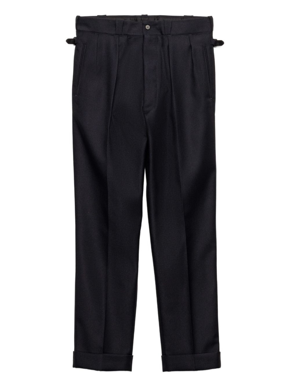 pleated trousers Highlights - Blue - Pleated front - Adjustable waist tabs - Button fly - Welt pockets - Turn-up hem Composition Wool 100% Washing instructions Read Manufacturer Guidelines