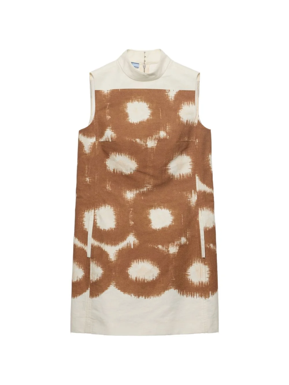 printed canvas mini-dress Highlights - This canvas mini-dress, a pure expression of prada's unconventional aesthetic, blends past and present, creativity and rigor. the sleek silhouette combines clean lines with the modernist, geometric character of the abstract print. - Circle print - A-line fit - Unlined garment - Funnel neck - Back metallic zipper closure - sleeveless - inseam pockets - Straight hem Composition Cotton 100% Washing instructions Read Manufacturer Guidelines