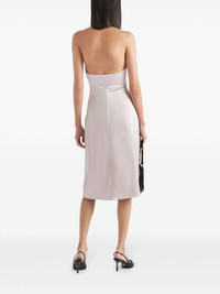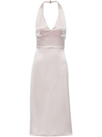 Re-Edition 1995 halterneck midi dress '90s minimalism underpins this silk-satin Prada dress. It's cut to a sleek, fluid silhouette accentuated by clean, simple lines and features a halter neckline and tonal logo embroidered at the lower back. Highlights - Light pink - Silk satin - Embroidered logo - Halterneck - V-neck - Sleeveless - Fitted waistline - Low back - Straight hem - Mid-length Composition Silk 100%, Satin 100% Washing instructions Read Manufacturer Guidelines