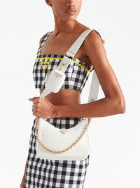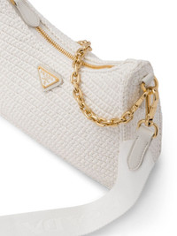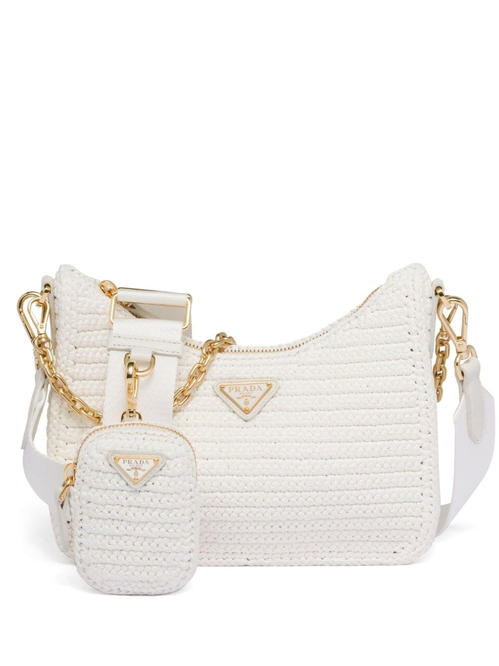 Re-Edition crochet-knit shoulder bag Prada updates its iconic Re-Edition 2005 style with a raffia construction. This white iteration is punctuated with the brand's signature plaque at the front and fitted with a chain-link top handle and shoulder strap. Highlights - White - Recycled nylon/straw - Interwoven design - Enamel triangle logo - Logo tag - Removable pouch - Single chain-link top handle - Adjustable detachable shoulder strap - Top zip fastening - Main compartment - Logo-print lining - Internal logo plaque Composition Straw 100% SIZE & FIT Measurement DEPTH 2.36 in(6 cm) HEIGHT 7.08 in(18 cm) WIDTH 8.66 in(22 cm) STRAP 33.46 in(85 cm)