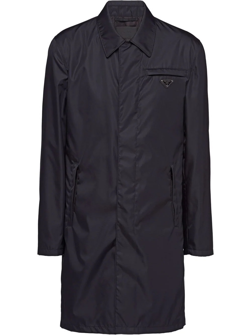 Re-Nylon triangle-logo raincoat Each season marks a chance for Prada to present classic wardrobe staples with a signature stamp of approval. A fine example is this raincoat, which comes crafted from its Re-Nylon recycled material for a practical and sustainably focused finish. Highlights - Black - Recycled nylon - Front button fastening - Long sleeves - Slip pockets to the sides - Mid-length Composition Nylon 100%