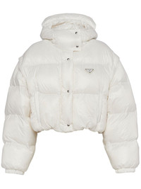Re-Nylon convertible down jacket This padded jacket from Prada benefits from detachable sleeves that allow this design to be transformed into a vest. Meanwhile, the iconic enamel triangle provides a branded finish to this innovative design. Highlights - White - Recycled nylon - Down-feather filling - Padded design - Silver-tone hardware - Detachable sleeves - Enamel triangle logo - Slouchy hood - High neck - Front press-stud fastening - Drop shoulder - Long sleeves - Elasticated cuffs - Cropped Composition Recycled Polyamide 100%