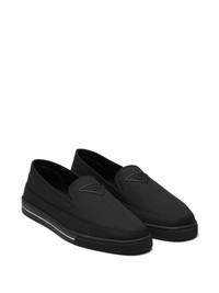 Re-Nylon embossed logo slip-on trainers Crafted in a tonal design, these Prada slip-on sneakers are punctuated with the brand's iconic triangle logo to the front. Set atop a flat rubber sole, the effortless style exhibits the label's sports-inspired aesthetic. Highlights - Black - Embossed rubber triangle logo - Removable leather-covered insole Composition Outer: Nylon 42%, Polyester 42%, Polyurethane 16% Lining: Calf Leather 100%, Fabric 100% Sole: Rubber 100%