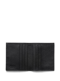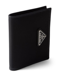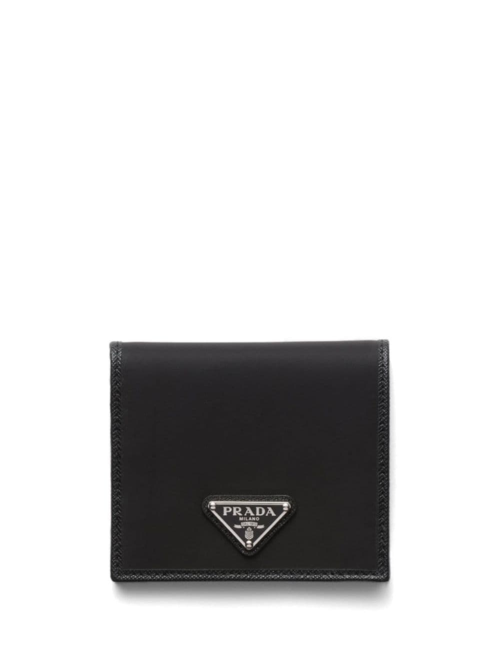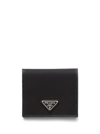 Re-Nylon enamel-triangle logo wallet Highlights - Black - Recycled nylon - Saffiano leather trim - Enamel triangle logo - Bi-fold design - Internal card slots - Internal note compartment - Debossed internal logo - Saffiano leather lining Composition Lining: Leather 100% Outer: Nylon 100% SIZE & FIT Measurement LENGTH 3.93 in(10 cm) WIDTH 3.54 in(9 cm)