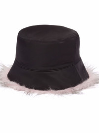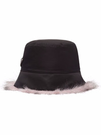 Re-Nylon faux-fur trim bucket hat Designed as part of Prada's Re-Nylon collection, this classic bucket hat is detailed with a contrasting alabaster pink faux-fur trim. In a versatile black hue, this piece will work for this season and beyond. Highlights - Black - Recycled nylon - Enamel triangle logo - Tonal stitching - Faux-fur trim - Dropped wide brim Composition Fabric 100%, Recycled Nylon 100%