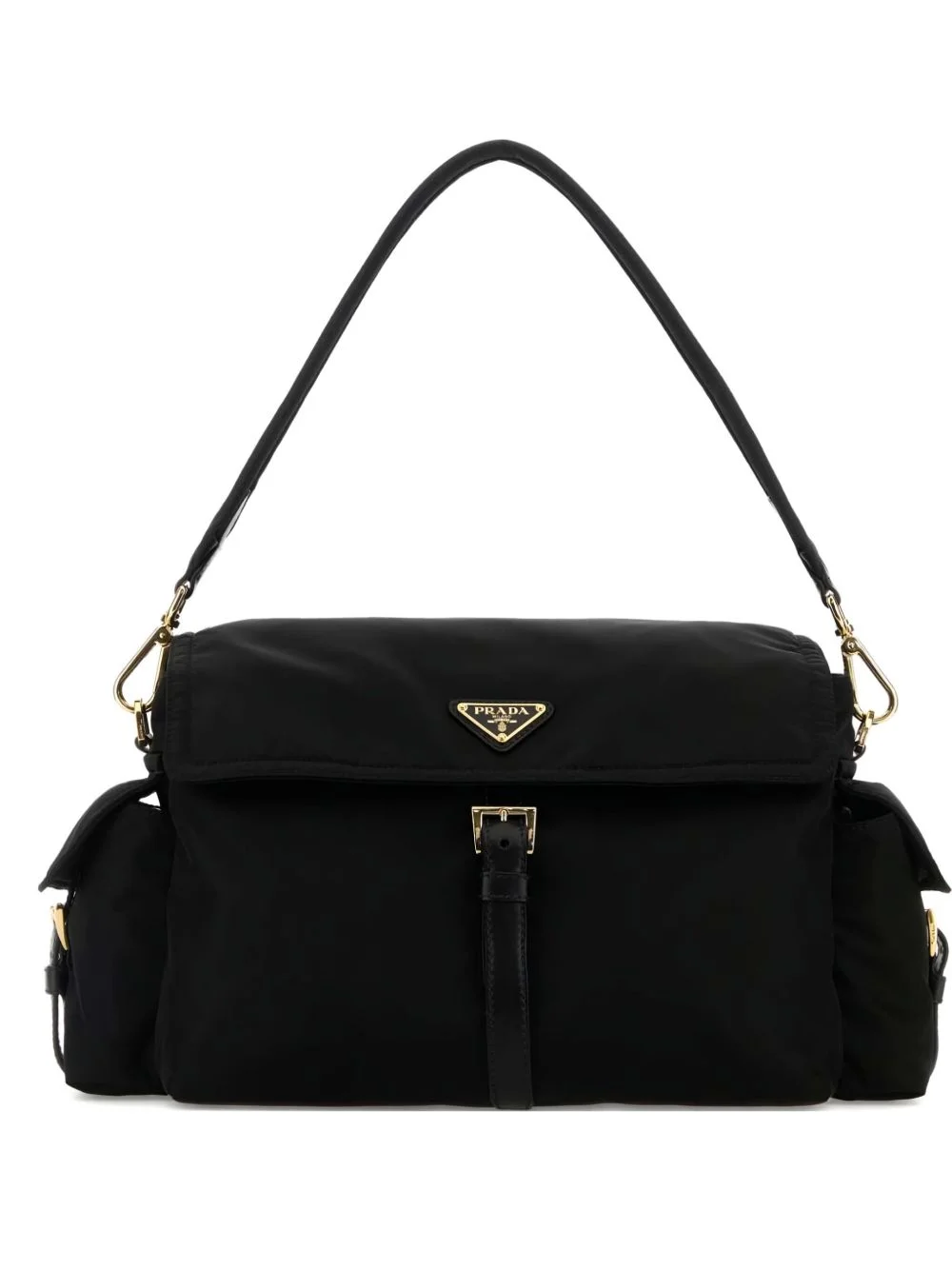 Re-Nylon flap-pocket shoulder bag Highlights - Black - Recycled nylon - Leather buckle - Side pockets - Top handle - Gold-tone logo triangle Composition Outer: Polyamide 100%, CALFSKIN 100% SIZE & FIT Measurement DEPTH 3.93 in(10 cm) HEIGHT 5.51 in(14 cm) WIDTH 11.81 in(30 cm)