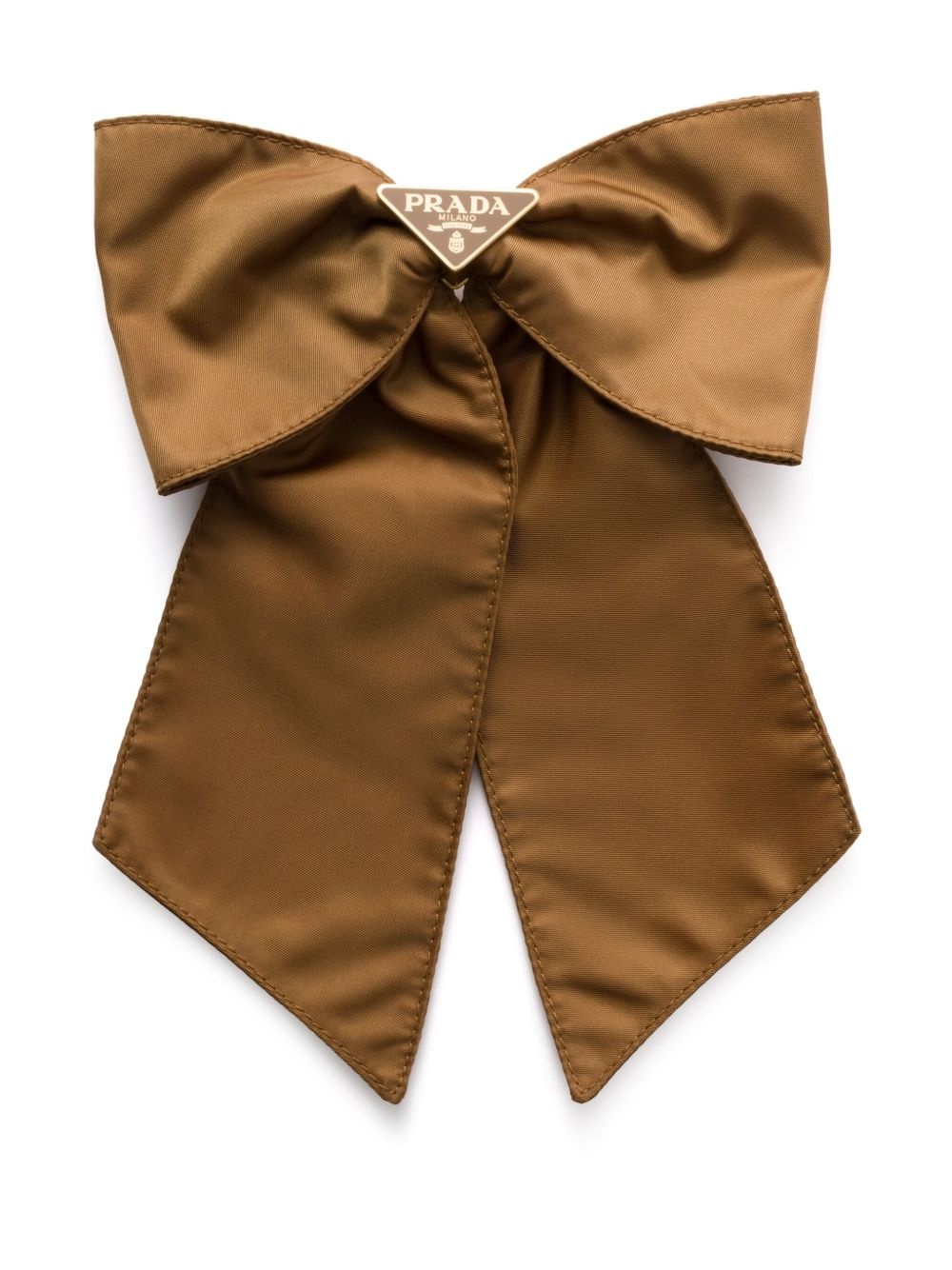 Re-Nylon hair clip Highlights - Barley brown - Clasp fastening - Enamel triangle logo - Oversize bow detail Composition Metal 100%, Recycled Polyamide 100% SIZE & FIT Measurement LENGTH 7.08 in(18 cm) WIDTH 3.54 in(9 cm)