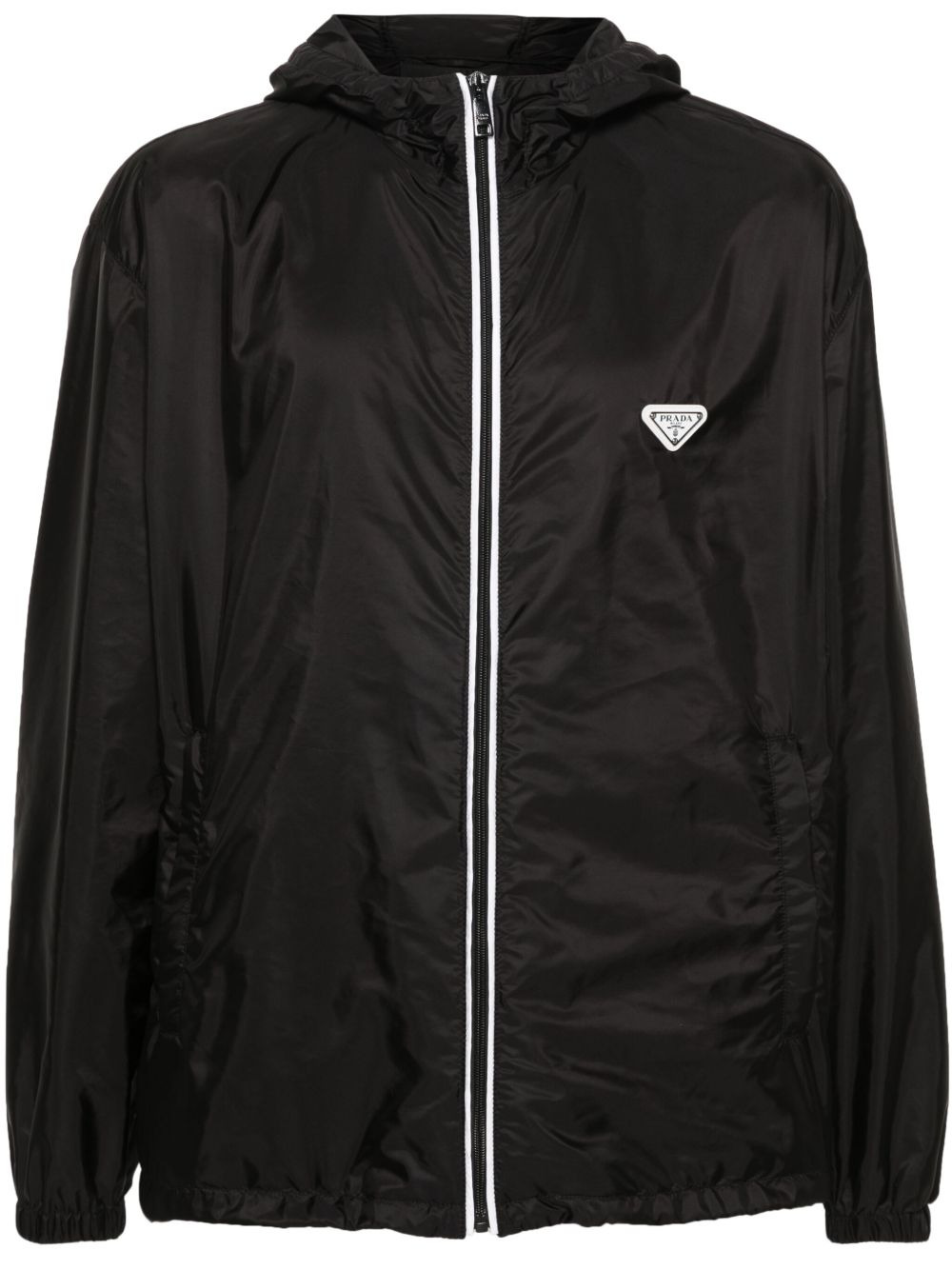Re-Nylon hooded jacket Highlights - Black - Shell - Enamel triangle logo at the chest - Contrasting stripe detail - Drawstring hood - Long sleeves - Elasticated cuffs - Two side zip-fastening pockets - Drawstring hem - Front zip fastening Composition Polyamide 100% SIZE & FIT Model measurements Height 6 ft 2 in(1.88 m) Bust/Chest 36.61 in(93 cm) Hips 35.82 in(91 cm) Waist 27.95 in(71 cm) FittingInformation Designed for a relaxed fit, this piece allows for comfort and movement when worn The internal drawstring at the hem allows for fitted preferences Made from a lightweight non-stretch fabric This piece fits true to size – take your usual size Washing instructions Hand Wash