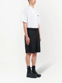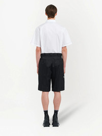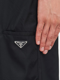 Re-Nylon bermuda shorts Prada's signature Bermuda shorts showcase a sustainable yet sleek recycled nylon fabrication. The tonal design is enhanced with an enamel triangle logo to the rear pocket for a branded touch. Highlights - Black - Recycled nylon - Enamel triangle logo - Straight leg - Concealed front zip fastening - Belt loops - Two side slit pockets - Two rear button-fastening jetted pockets - Rear welt pocket Composition Lining: Cotton 100% Outer: Recycled Nylon 100%
