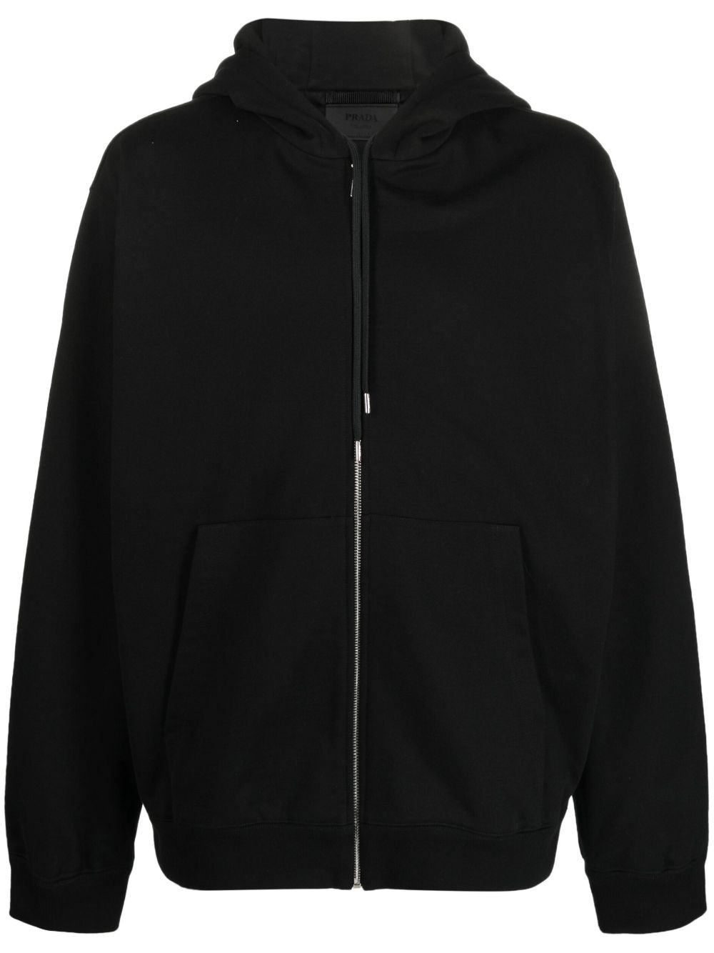 Re-Nylon logo-print hoodie Inspired by sports' garment, this PRADA hoodie showcases the brand's innovative take on essentials. It's crafted from soft cotton and embellished with a Re-Nylon insert that features the label's logo. Highlights - Black - Cotton - Logo print to the rear - Drawstring hood - Front zip fastening - Long sleeves - Two side slit pockets - Ribbed cuffs and hem Composition Cotton 100% SIZE & FIT Model measurements Height 6 ft 2 in(1.89 m) Bust/Chest 38.97 in(99 cm) Hips 38.18 in(97 cm) Waist 32.28 in(82 cm) FittingInformation Designed for a regular fit, offering a comfortable loose fit throughout the body The ribbed hem offers a close, comfortable fit Made from a midweight non-stretch fabric, this piece offers minimal elasticity when worn This piece fits true to size – take your usual size