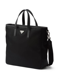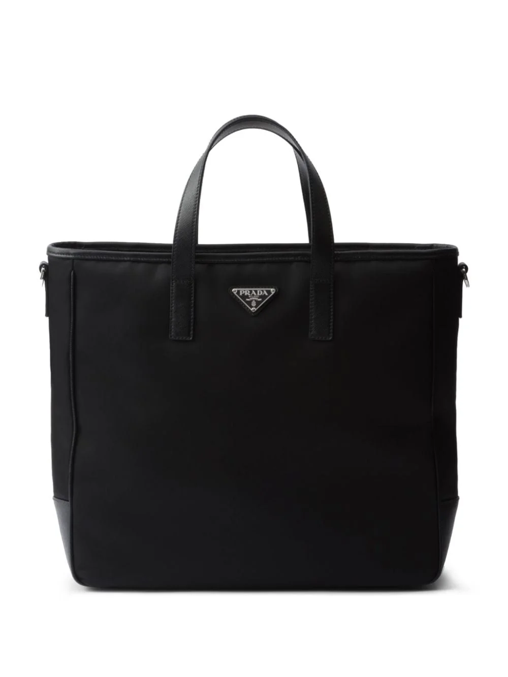 Re-Nylon logo tote bag Prada's iconic triangular logo plaque permeates throughout their collections, seen here adorning this minimalist Re-Nylon tote bag. Highlights - Black - Econyl® - Enamel triangle logo - Adjustable detachable shoulder strap - Two top handles - Internal zip-fastening pocket - Internal logo patch Composition Outer: Calf Leather 100%, Recycled Nylon 100% SIZE & FIT Measurement DEPTH 4.33 in(11 cm) HANDLE 5.51 in(14 cm) HEIGHT 12.59 in(32 cm) STRAP 26.37 in(67 cm) WIDTH 13.77 in(35 cm)