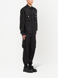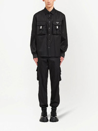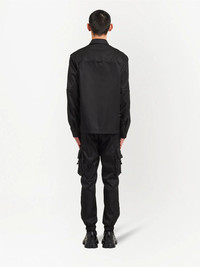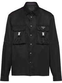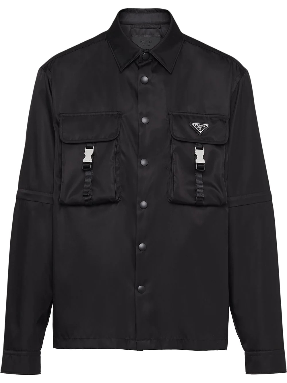 Re-Nylon triangle-logo shirt Known for its functionality and sustainability, Prada’s Re-Nylon is in line with the brand’s utilitarian feel. Seen here in a black hue, this signature construction is accented with a triangle logo patch and buckle detailing that adds to the contemporary aesthetic. Highlights - Black - Classic collar - Front press-stud fastening - Enamel triangle logo - Two chest flap pockets - Buckle fastening - Long sleeves - Buttoned cuffs - Straight hem Composition Recycled Nylon 100%