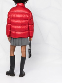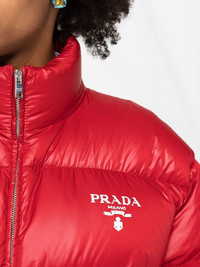 Re-Nylon puffer jacket Crafted from Re-Nylon, Prada's recycled nylon fabric, this puffer jacket cuts an oversized silhouette. The design finds its warmth through its goose feather filling and is finished with a contrasting logo print at the chest. Highlights - Red - Recycled nylon/goose down - Padded design - Logo print at the chest - Stand-up collar - Long sleeves - Elasticated cuffs - Front zip fastening - Two side zip-fastening pockets Composition Lining: Goose Down 100%, Recycled Polyamide 100% Outer: Recycled Polyamide 100% SIZE & FIT Model measurements Height 5 ft 11 in(1.8 m) Bust/Chest 31.49 in(80 cm) Hips 35.82 in(91 cm) Waist 24.8 in(63 cm) FittingInformation This piece fits true to size. We recommend you get your regular size Cut for a loose fit Made with a mid-weight non-stretch fabric Washing instructions Hand Wash