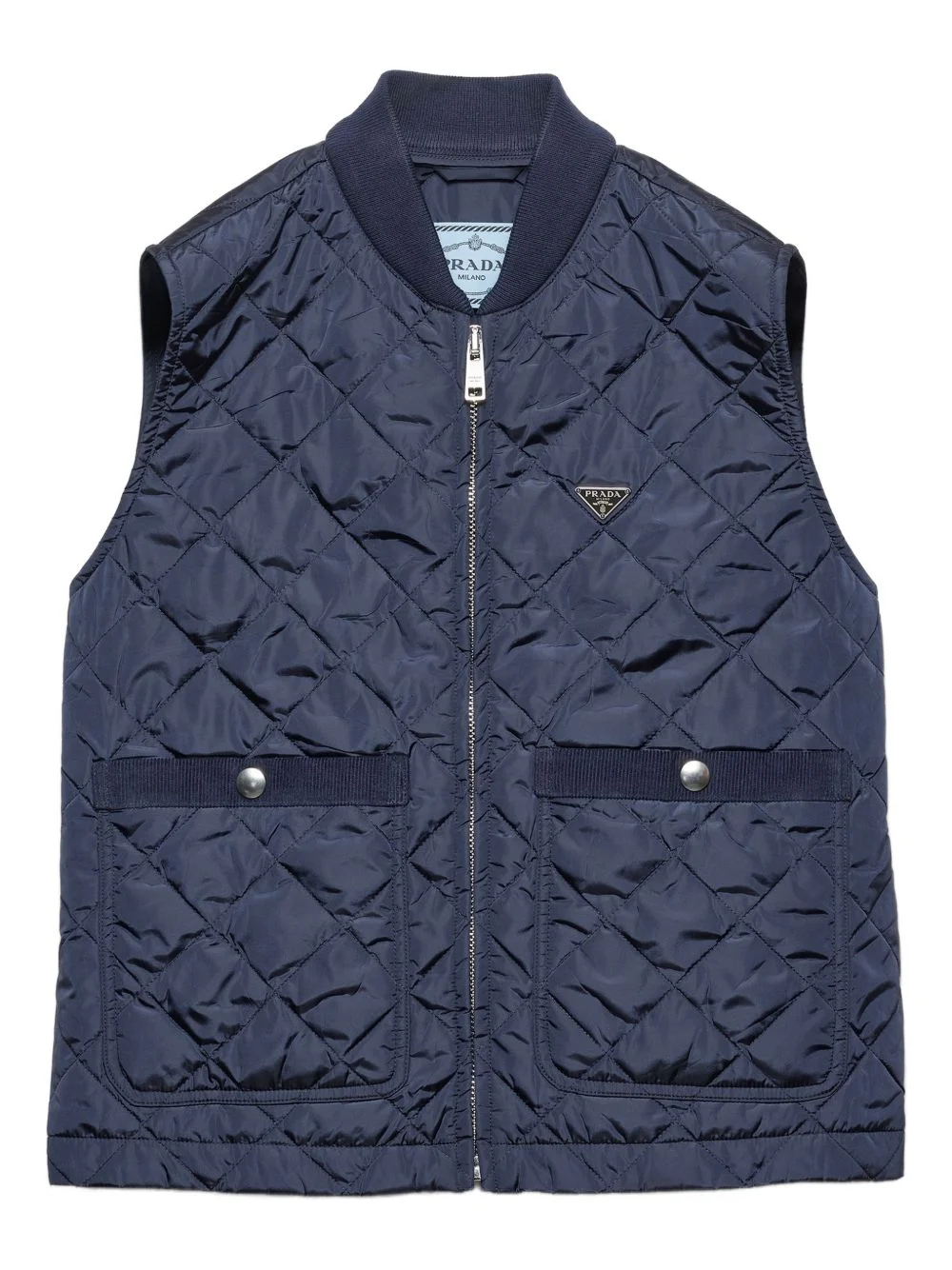 Re-Nylon ribbed knit quilted vest Highlights - Blue - Quilted - Ribbed knit collar - Zip closure - Flap pockets - Enameled metal triangle logo Composition Recycled Polyamide 100%