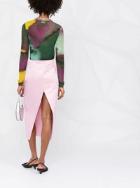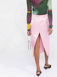 rear slit high-waisted skirt Crafted in Italy from delicate silk, this calf-length skirt evokes Prada's craftsmanship and tailoring background thanks to its tapered silhouette and high-cut slit at the rear. Sitting high at the waist, this piece is designed in a petal pink hue, seamlessly encapsulating the spirit of SS22. Highlights - Petal pink - Silk - Rear slit - Satin finish - Tonal stitching - High waist - Concealed side zip fastening - Straight hem - Mid-calf length Composition Silk 100% Washing instructions Dry Clean Only