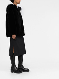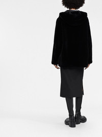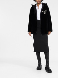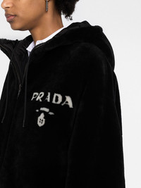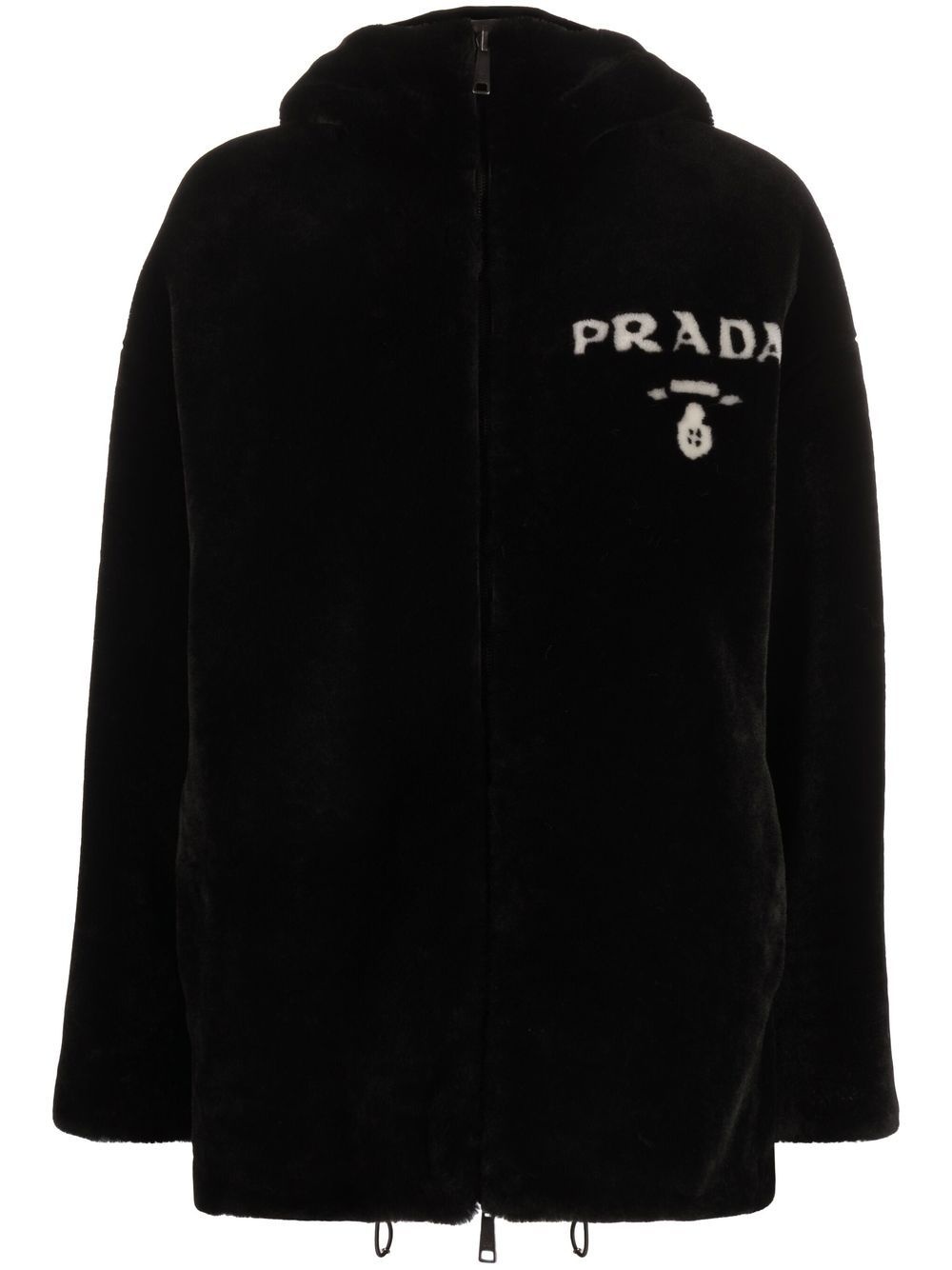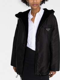 reversible shearling jacket Boasting one side made of soft, cosy shearling and the other in a glossy fabrication, this reversible coat is designed to reflect the dualistic style of Prada's collections through a juxtaposition of materials. Highlights - Black - Cream white - Shearling - Reversible - Enamel triangle logo - Logo print at the chest - Classic hood - Front zip fastening - Long sleeves - Slip pockets to the sides - Drawstring hem Composition Outer: Sheepskin 100% Lining: Recycled Polyester 100% SIZE & FIT Model measurements Height 5 ft 11 in(1.8 m) Bust/Chest 31.49 in(80 cm) Hips 35.82 in(91 cm) Waist 24.8 in(63 cm) FittingInformation This piece fits true to size. We recommend you get your regular size Cut for a loose fit Made with a mid-weight non-stretch fabric